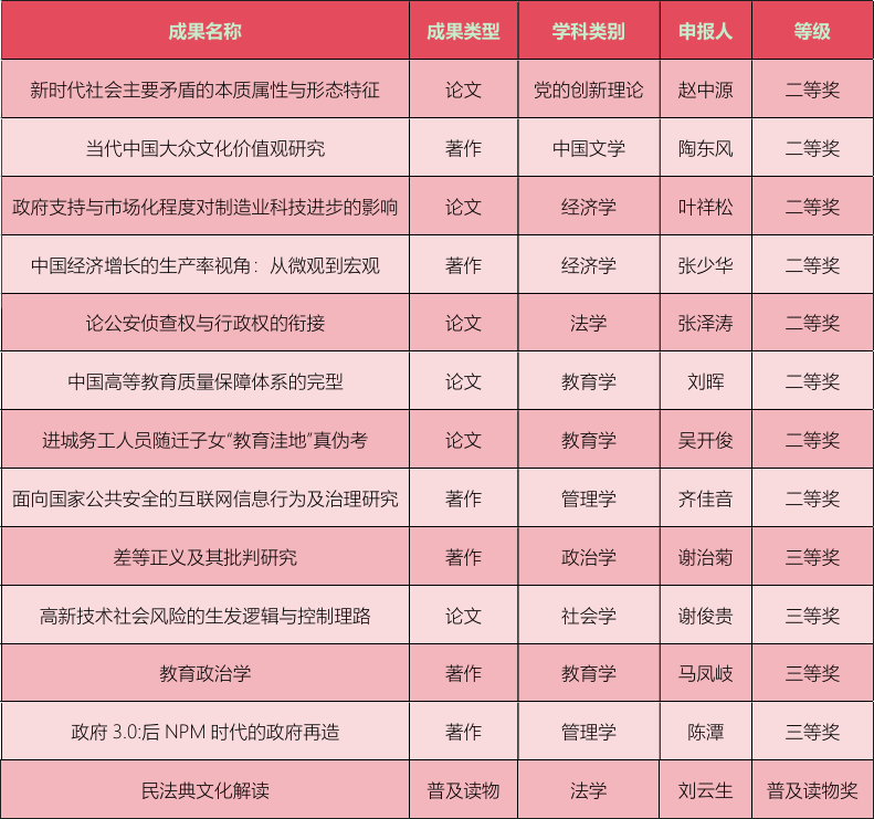 据悉,第九届高等学校科学研究优秀成果奖(人文社会科学)获奖成果共1496项(含香港、澳门高校获奖成果),其中一等奖125项、二等奖545项、三等奖602项、普及读物奖21项、青年成果奖203项。杏吧